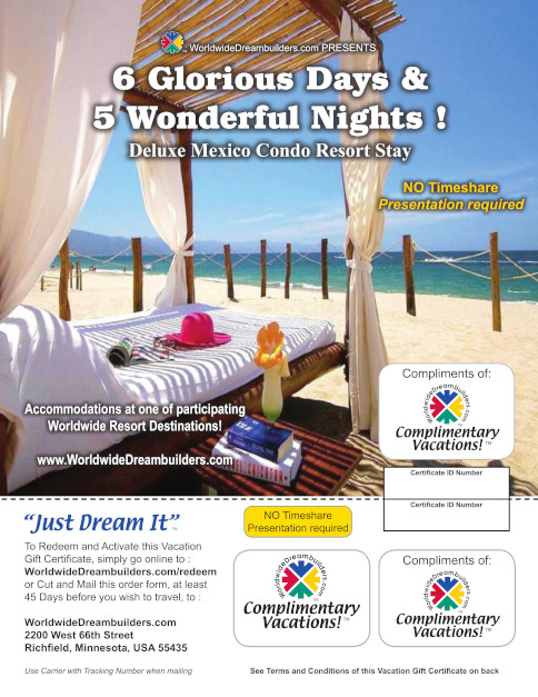 NO timeshare presentations are required to redeem this Vacation Gift Certificate.